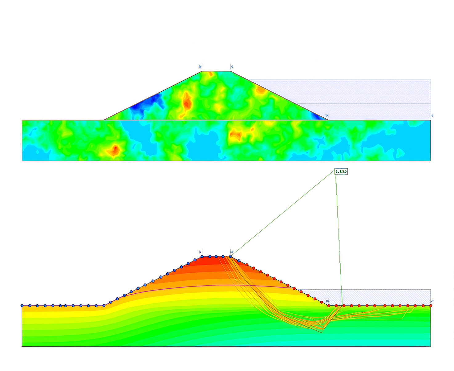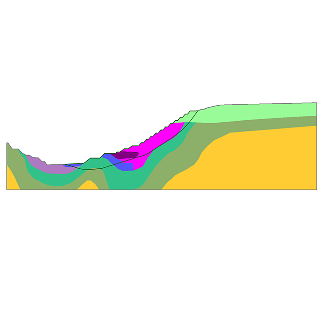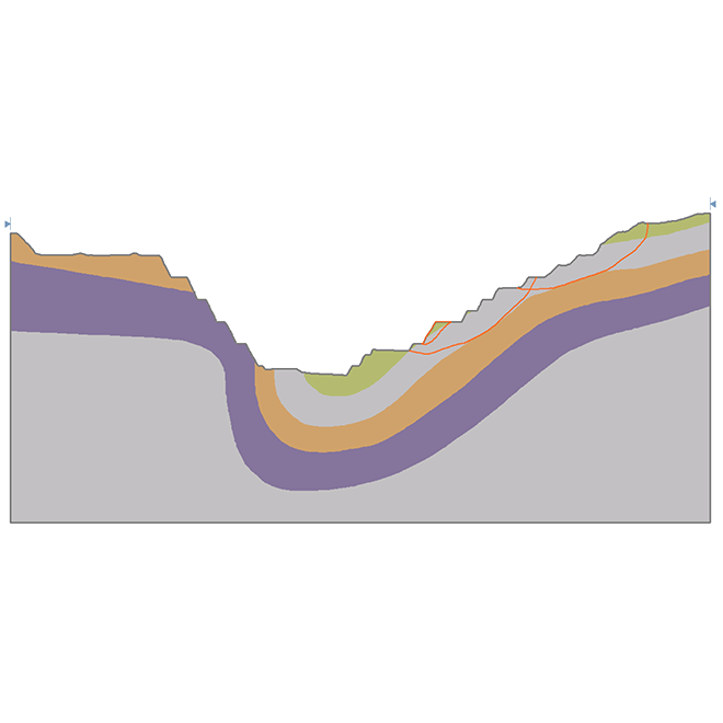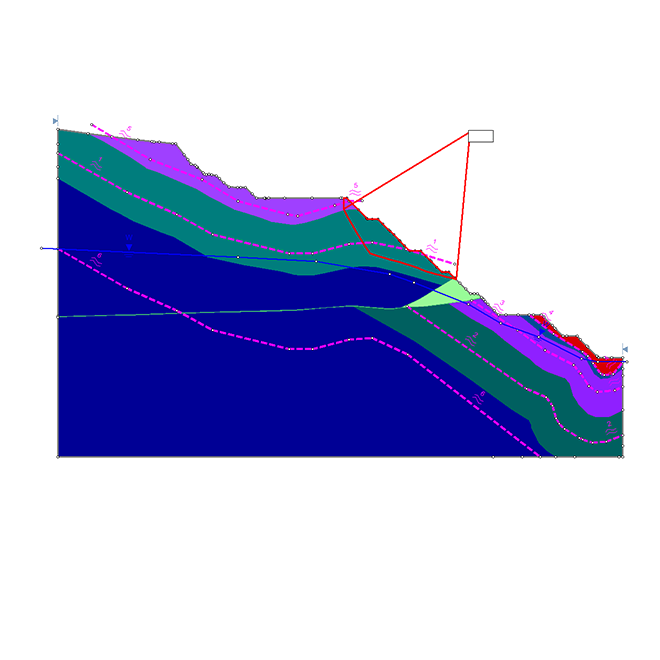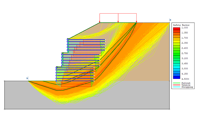 Realize análises de estabilidade em taludes rochosos ou de solo para identificar superfícies de ruptura críticas. Você pode modelar diversos tipos de taludes, incluindo muros de contenção e estruturas de solo reforçado.