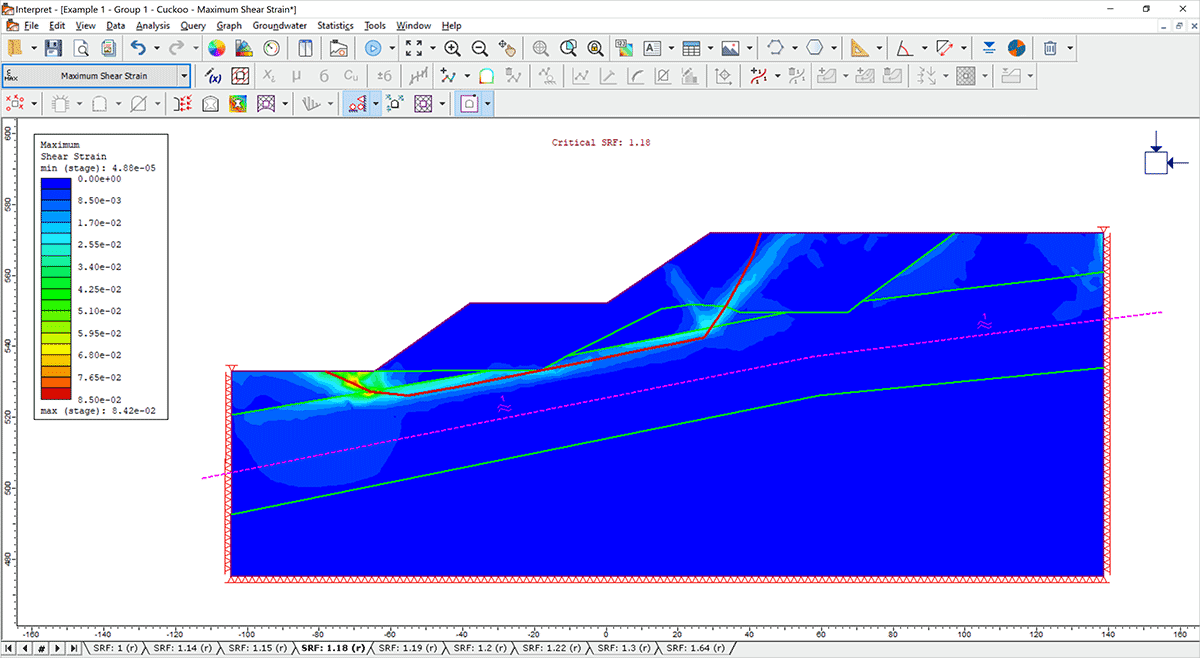 Arraste e solte seu arquivo Slide2 no RS2 e execute uma Análise de Redução da Resistência ao Cisalhamento. Em seguida, compare diretamente o fator crítico de redução da resistência com seu fator de segurança.