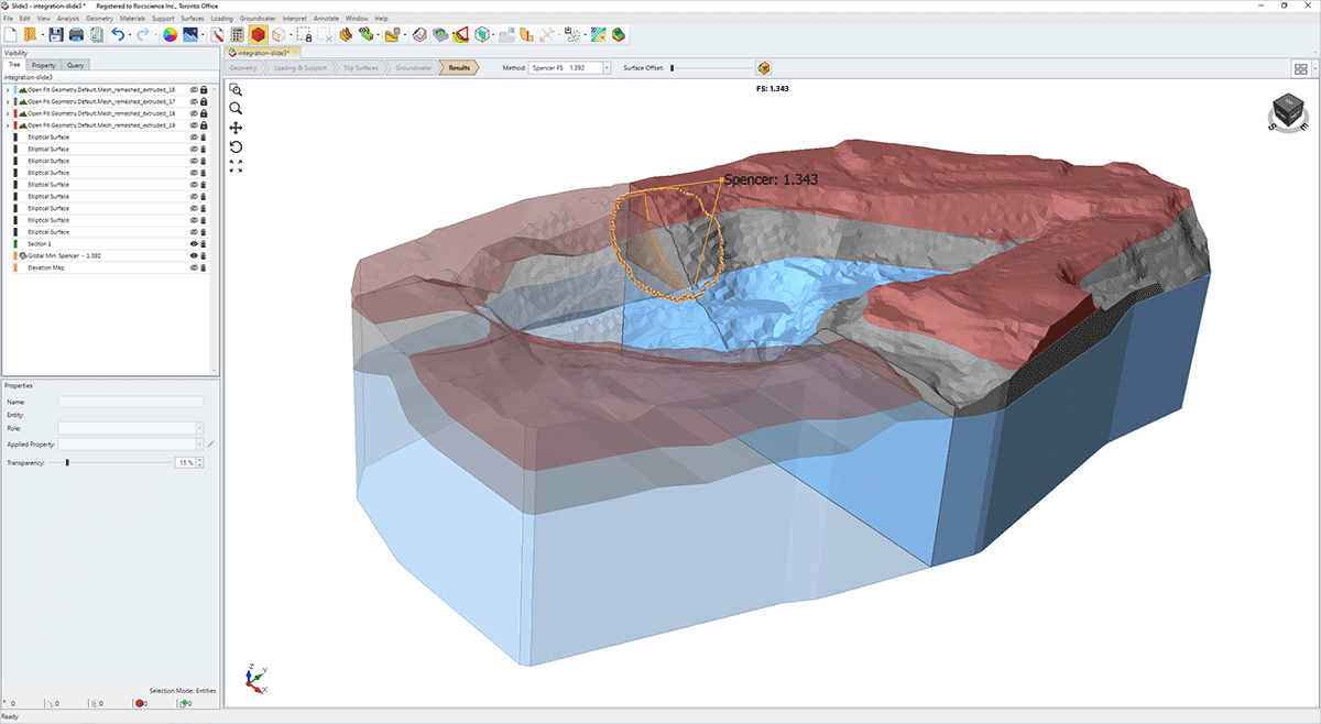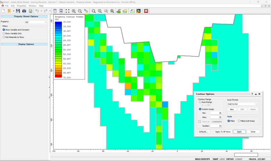 Exporte modelos de blocos detalhados do Slide3 para o Slide2 e gerencie e visualize facilmente parâmetros em nível de bloco, como Dip, UCS e GSI, para obter informações mais aprofundadas sobre o comportamento do material. Use o Visualizador de Propriedades para ver valores de parâmetros precisos, garantindo decisões corretas e bem fundamentadas.